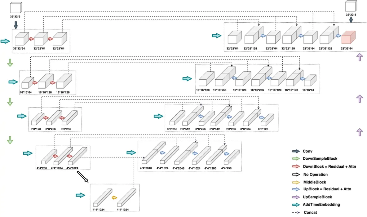 其中 DownBlock 和 UpBlock 结构一样:(TimeEmbedding 即为和 Transformer 中位置编码一样的三角函数编码,经过一个简单的多层感知机(MLP)变换后的结果)
