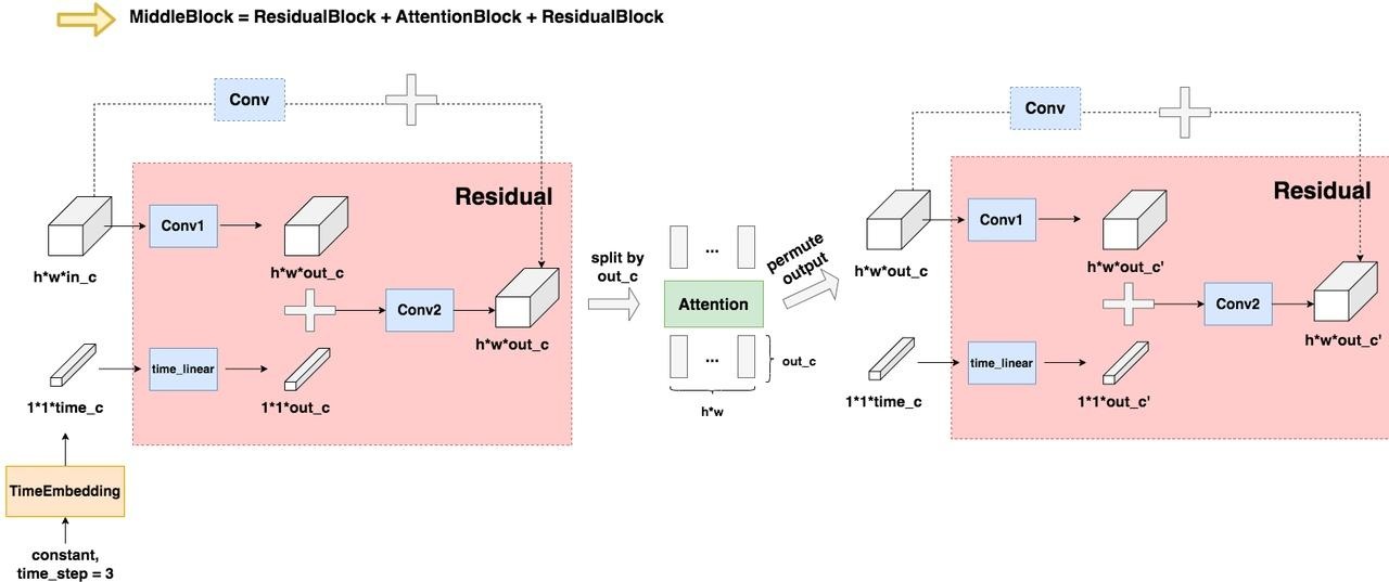 MiddleBlock 则是一个对称的结构,不过其实也可以贪方便直接使用 DownBlock 替代掉: